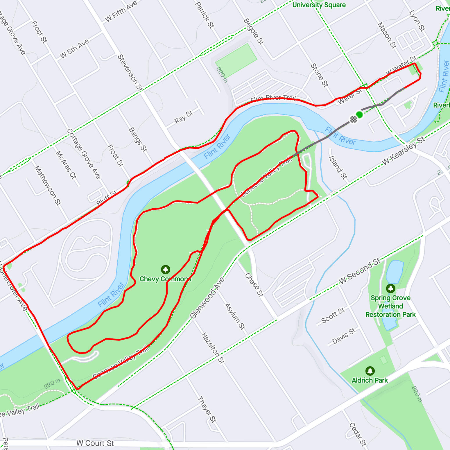 Parking + CourseParking: Chevy Commons has two parking lots along Kearsley near Grand Traverse and another at Chevrolet and Kearsley.There is also street parking along Grand Traverse. There will be limited parking at Tenacity and the Good Beans Cafe.Start/Finish Line: Chevy Commons pathway between Factory Two and Tenacity.The route loops by Factory One, joins the Flint River Trail along Water and Bluff Street, turns at Chevrolet, then takes an outer and inner loop in Chevy Commons.